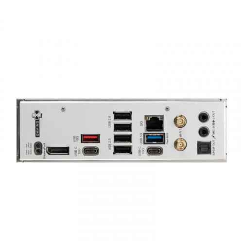 Puertos E/S, Conectores | Internos – 1 x conector de alimentación (ATX_PWR) – 1 x conector de alimentación (CPU_PWR) – 1 x ventilador de CPU – 1 x ventilador combinado (ventilador Pump_Sys) – 4 x ventilador del sistema – 2 x panel frontal (JFP) – 1 x intrusión de chasis (JCI) – 1 x audio frontal (JAUD) – 1 x puerto de comunicación (JCOM) – 1 x conector del controlador de sintonización (JDASH) – 2 x Conector LED RGB V2 direccionable (JARGB_V2) – 1 x conector LED RGB (JRGB) – 1 x cabezal de pin TPM (compatible con TPM 2.0) – 4 x puertos USB 2.0 – 2 x puertos USB tipo A de 5 Gbps – 1 x puerto USB tipo C de 5 Gbps Externos – Botón Borrar CMOS |